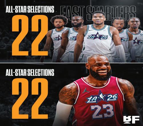 詹姆斯生涯第22次入选全明星,与东部首发五人入选次数之和相同